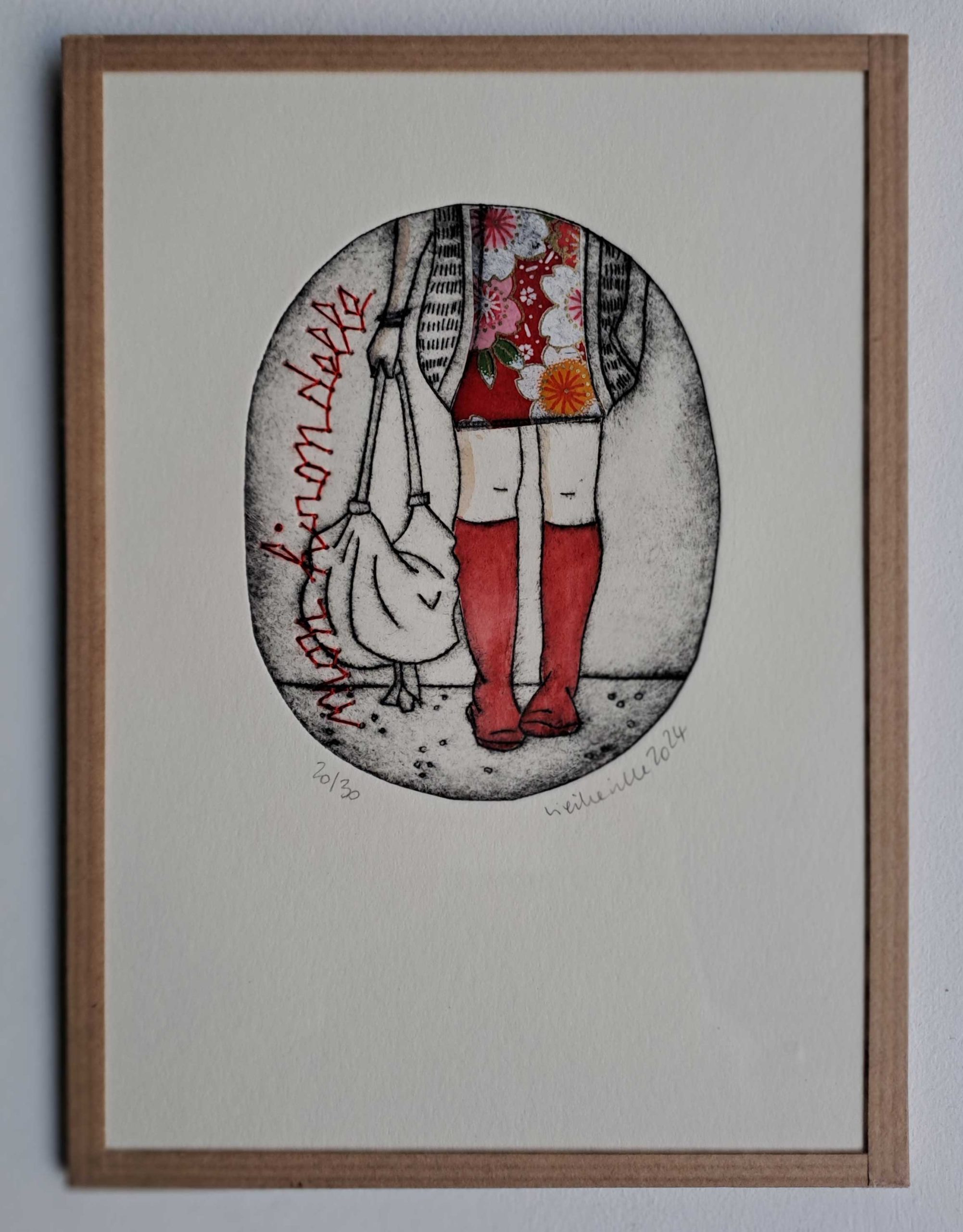 Cette gravure à la pointe sèche de Nathalie Vieilleville est rehaussée d’aquarelle et de collages. Elle est encadrée d’ un ruban de Kraft gommé et  mesure 21 x 15 cm.