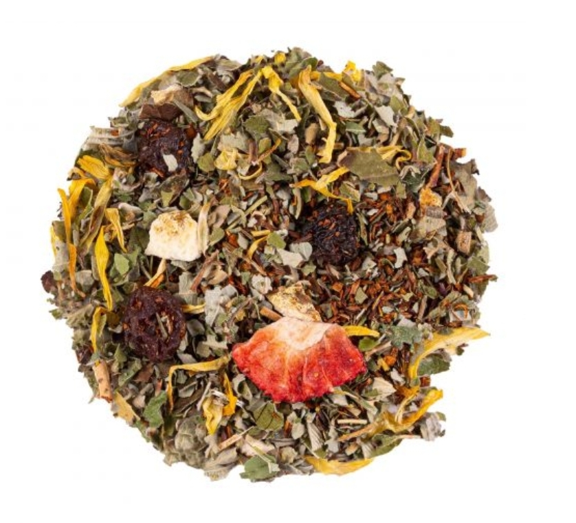 Ingrédients: rooibos naturel, feuilles de mûre, raisin, rooibos vert, arôme naturel, fleurs de souci, écorces d’orange, fraise, fleurs de bleuet