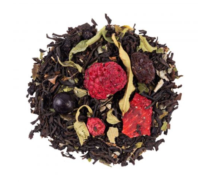 Ingrédients: thé noir Assam, Inde du Sud, feuilles de mûre, arôme naturel, verveine entière, raisin, baie de sureau, framboise, mûre, fraise, cassis, groseille