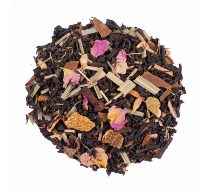 Ingrédients: thé noir Assam, Inde du Sud, bâtons de cannelle, citronnelle, écorces d’orange, clou de girofle, pétales de rose, cardamome