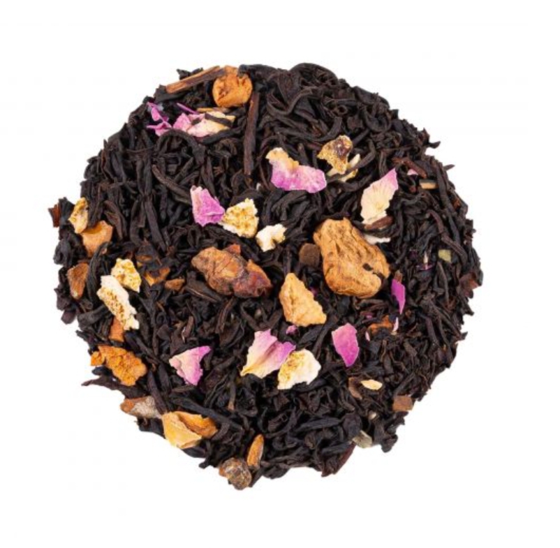 Ingrédients: thé noir Assam, Inde du Sud, écorces d’orange, pomme, bâtons de cannelle, arôme naturel, pétales de rose, cardamome