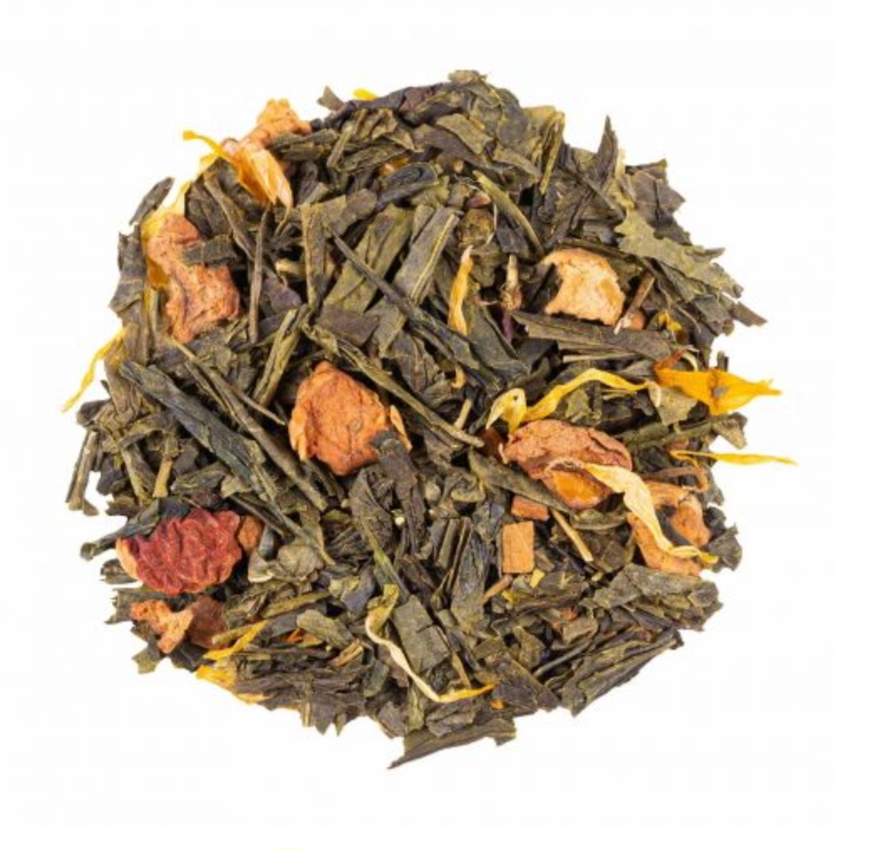 Ingrédients: thé vert China sencha, pomme, bâtons de cannelle, gingembre, arôme naturel, fleurs de souci, vanille, bourbon